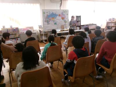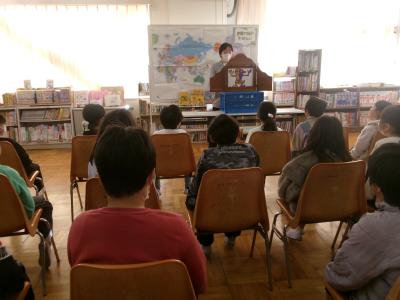 「世界の国のおはなし」というテーマで本を紹介してくれました。世界の通学路の話や国語の三年とうげを書いた