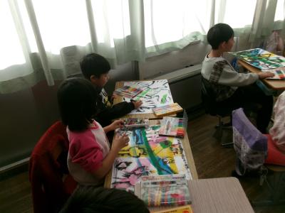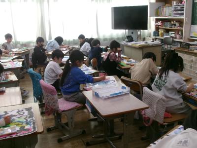 今日の1時間目、2年生のクラスで図工の授業がありました。友達の作品をお手本として、工夫し