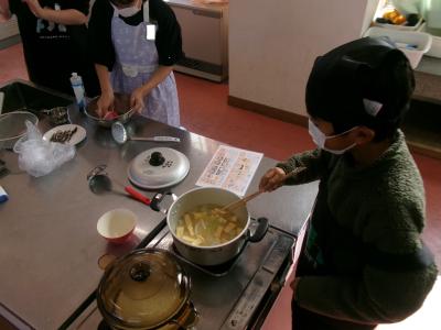 をとったみそ汁を作りました。時間と火加減に気を付けて、調理していました。