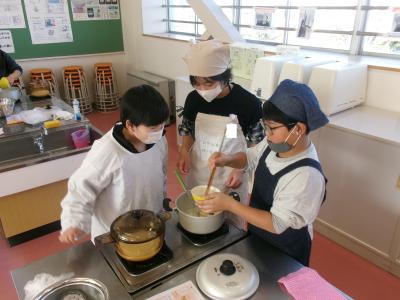 今日の3・4時間目は5年生の調理実習がありました。昨日とは別のクラスです。ご飯をなべで炊き、煮干しでだし