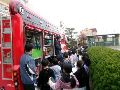 来てくれました。外では消防車の説明をしてくれました。いろいろな仕組みを教えてくれました。