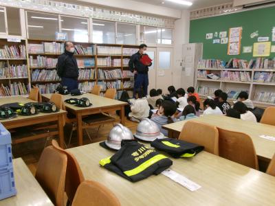 今日の3・4時間目は3年生の社会の授業がありました。吉川消防南分署の方々が消防車で学校に