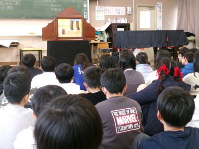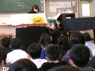 今日の朝の活動は読み聞かせがありました。お話を聞いたのは5年生です。大型紙芝居と大型絵本の