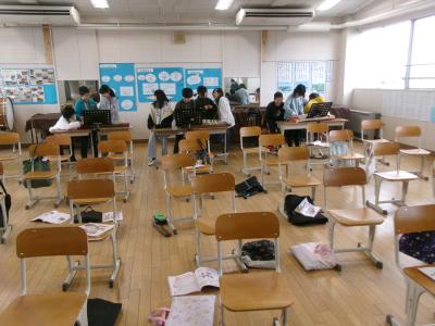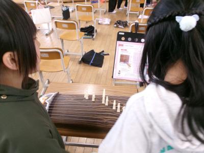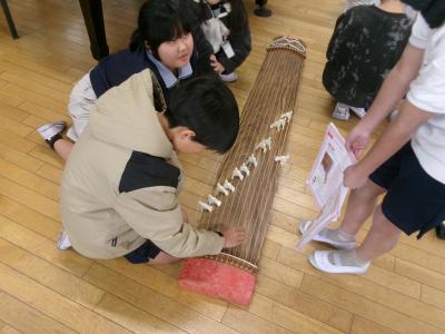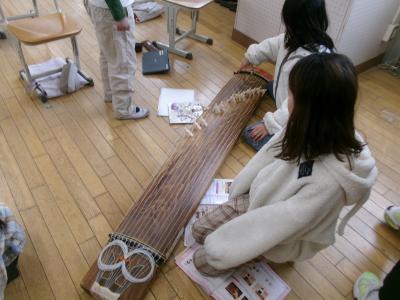 が音楽の授業をしていました。グループに分かれて琴をひいていました。順番に楽しく、琴をひいて