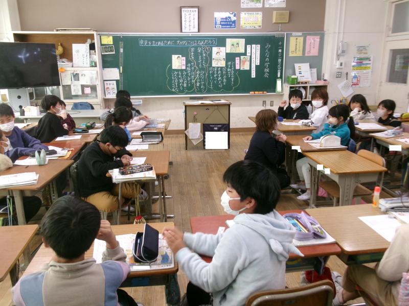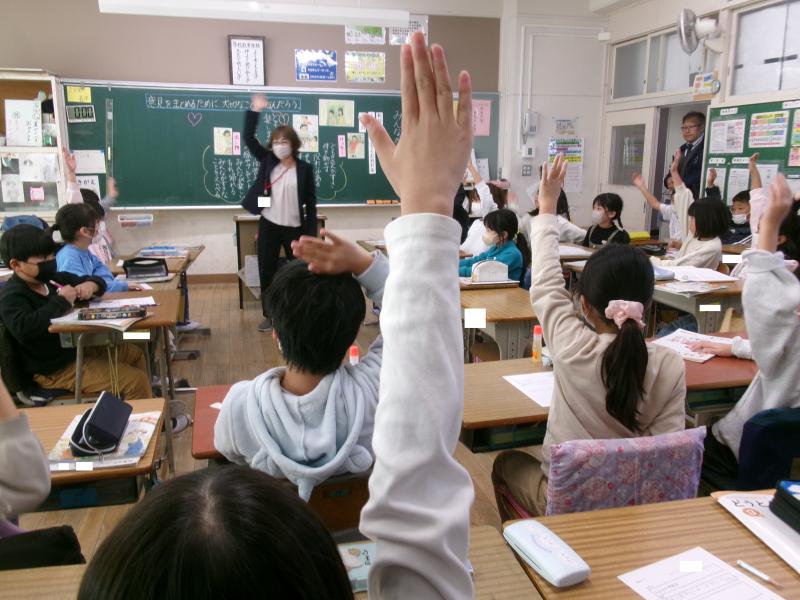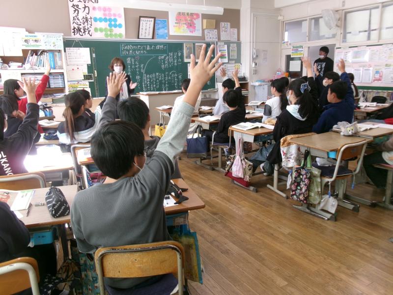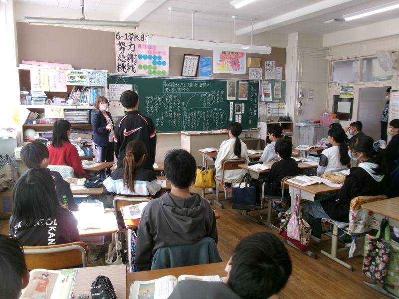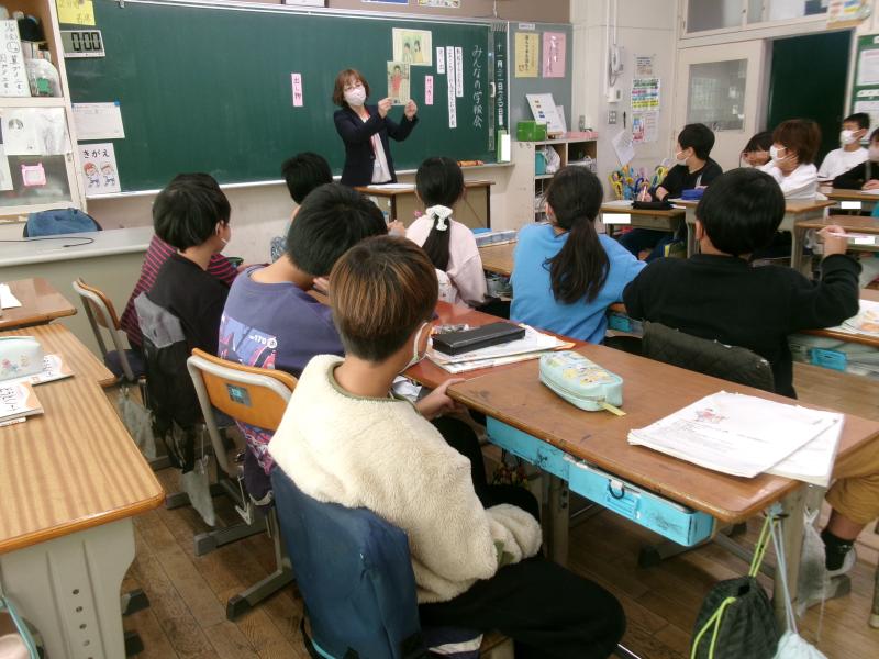今日は、道徳の示範授業がありました。三輪野江小学校の先生が来校し、3年生のひとクラスと6年生のひと