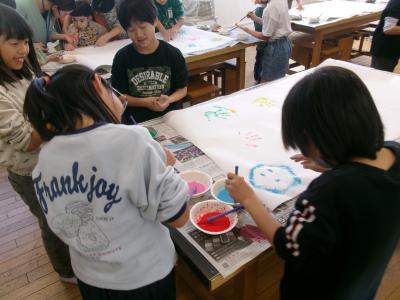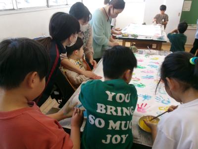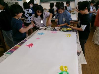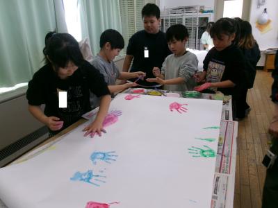 一緒に図工の学習をしていました。手だけで描くというもので、子供たちは手に筆で絵の具をたっ