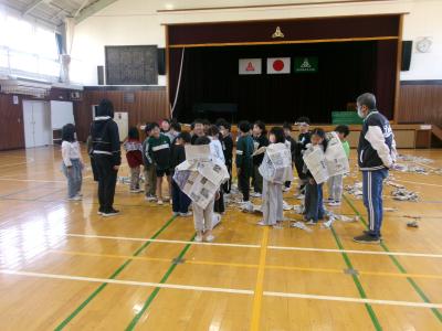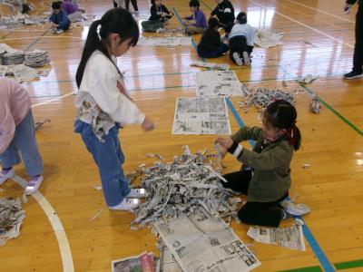 たちは新聞紙をちぎったり、丸めたり、ねじったり、いろいろ試していました。体育館には新聞紙