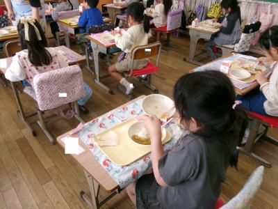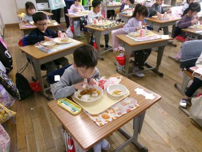 今日から1年生も普通給食になりました。今日はわふうチキンカレーとキャベツのソテー、牛乳とお祝いデザートでした。おいしいともりもり食べていました。