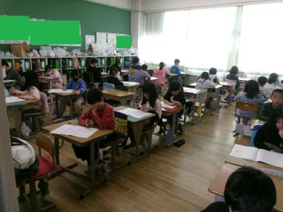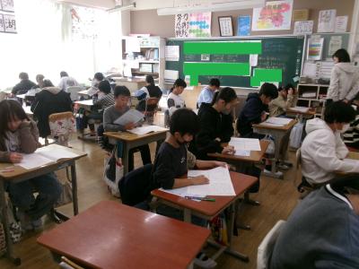 今日の2時間目と3時間目は全校で学力テストに取り組みました。2時間目が国語で3時間目が算数でした。学校中