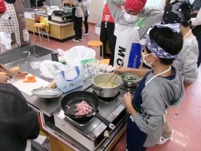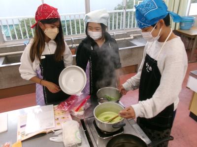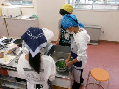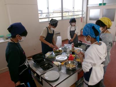5、6時間目は家庭科室で6年生のクラスが調理実習をしていました。主菜と副菜の2つのおかずを作っていまし