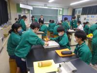 1年生は家庭科の裁縫の授業。針を使った玉結びの練習です。