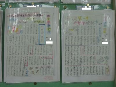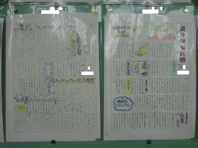 1年生の校外学習のまとめの新聞が、廊下に掲示されています。小さな方眼の台紙に、記事がびっしりと書かれています。内容も読んでいて興味深いです。素晴らしい!