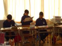 この日は1時間目から3時間目までがテスト。1年生は英語・社会・数学、2年生は数学・英語・社会、3年生は社会・数学の2教科をおこないました。1日目同様、集中して取り組んでいる様子が印象的です。表彰集会を経て、給食後に14時前には生徒は下校していきました。
