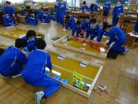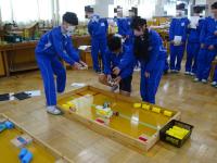 今日の2年生の技術の授業では、以前から学習を進めていたロボコンのまとめが行われました。クラスの中でトーナメント戦を行い、クラス代表を決めるのです。試合の最初に、各班ごとに「工夫した点」や「改善した点」等をまとめ、クラスの皆さんに紹介をしてから始めました。