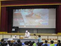 吉川で400年続く料亭「福寿家」さんを講師にお招きし、3年生が昔の吉川の様子や川魚料理、なまずなどの地域学習を行いました。子供たちは、昔の吉川の様子を聞くと、今との違いにとても驚いていました。写真で説明してくださったので、分かりやすかったです。また、吉川で川魚料理が盛んな理由やナマズの生態についても教えていただきました。最後には本物のナマズに触れ合う機会もいただき、子供たちは大喜びでした。大きなナマズの迫力に圧倒されながらも、「かわいい」と撫でる様子が多くみられました。食事を通して命をもらっている私たち。いつでも感謝の気持ちを忘れないようにしたいですね。ご多用の中、説明してくださった福寿家さん、本当にありがとうございました。