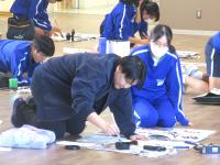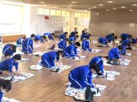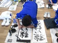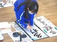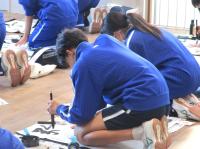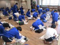 吉川中学校には各階に広いホールが存在しています。ある時は生徒たちの交流の場として、またある時は学年集会の会場として、そして本日は書初めの練習場所として活用されています。本日の5時間目は、3階の3年生フロアと4階の2年生フロアで、同時に書初めの練習が行われていました。静かに集中した少し緊張感のある空気が、良い作品作りにつながります。納得のいく作品ができますように、と心の中で静かにエールを送りました。