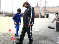 6時間目の校庭で、9組の生徒たちがペットボトルロケットの発射実験を行っていました。装置のペダルを踏み、圧力を充分に高めた後、「3・2・1、発射!」の合図でペットボトルロケットが飛び立ちます。圧力の加減や、ペットボトルの角度によって、ロケットの飛び方が変わるので、生徒たちは何度も何度も発射実験を繰り返し、ベストな形を探っていました。