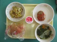 今日の給食のメニューは、ごはん、牛乳、チンゲンサイと豆腐のスープ、春巻き、大根の炒めナムルでした。