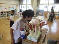 6日(木)、給食センターから学校栄養教諭の先生をお招きし、学校で食べている給食ができるまでの様子を教えていただきました。じゃがいもの皮を自動で剥いていく機械や、キャベツの葉を1枚1枚手作業で洗っていくところ、大きな鍋で炒め物を作っているところなどを紹介していただきました。給食センターの中の様子など、初めて知ることばかりで子供たちは大喜びでした。感想発表では、「給食を食べるまでにこんなに多くの人が関わっていると知って驚いた」や、「一生懸命作ってくれているので、なるべく残さないで食べないといけない」と話していました。給食の時間になると、「いつもよりおいしく感じる」と、嬉しそうに食べていました。そして、残さず食べられた子もいつもより多かったです。 いつもおいしい給食をありがとうございます。ごちそうさまでした。