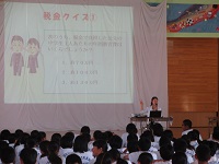 夏休みの課題で、1・2年生が人権に関する作文を書きました。約200点を出品し、その中から10点の優秀作品が選考され、さらに1点が県へ出展されました。人権擁護委員の方々が結果を伝えに来校されました。