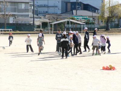 1年生とボール遊びをしていました。1年生が楽しく遊べるよう6年生は内容もよく考えられていま