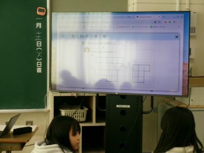 4年生は算数の学習をしていました。少人数クラスに分かれて面積の学習です。1㎠をもとにして、広さを比べる