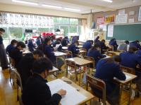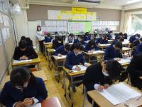 期末考査2日目は、1年生が「英語・保健体育・社会・数学」、2年生は「社会・英語・数学・音楽」がおこなわれました。写真は2年生の様子です。2つの学年とも英語があり、リスニングを真剣に聞いている様子が印象的でした。テストから解放された1,2年生は、14時には下校しました。