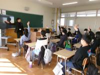 最初は英語の授業。中学校の先生のテンポのよい指導に、子どもたちは少し緊張しながらも楽しそうに取り組んでいました。