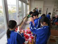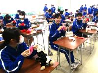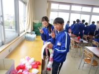 美術室を覗いてみると、1年生がお花紙で紅白の花飾りを作っていました。この花を目にすると、「卒業」のシーズンが近づいていることを感じます。体育館では、2年生のドッジボールが白熱していました。当たっても痛くない柔らかなボールですが、中学生の「本気」からは迫力が感じられました。3年生のフロアには、保健室から卒業生への“贈り物”が展示されていました。義務教育の9年間で、心身ともに自分がどれだけ大きく成長したかを振り返るよい機会になることと思います。保護者も、生徒自身も、教職員も、地域の皆様も、様々な思いを胸に・・・卒業まであと2週間です。