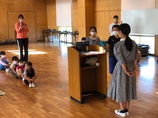体育館に学年で集まって、なまりん?のお話を聞いたり
