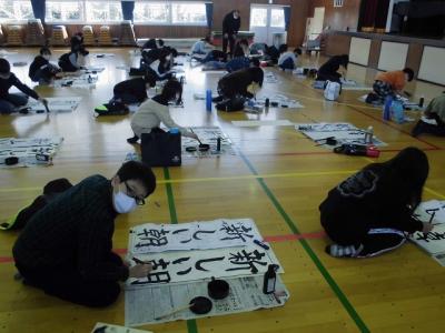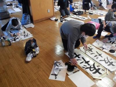 書初め競書会を実施しました。本日も昨日に続き、寒い日となりましたが、3年生以上の子供たちは、体育館やふれあいホールなどの広い場所でも寒さを感じさせず、熱心に書初めに取り組んでいました。2時間続きの学習でしたが、集中して取り組むことができていましたね。みんなとても頑張りました。1,2年生は、教室での競書会をフェルトペンで行いました。
