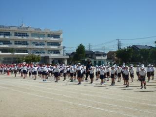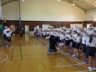 運動会の練習が始まっています。体育朝会では、開閉会式や応援合戦の練習をしました。