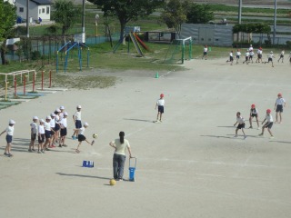 今日の運動会の全体練習は、大玉ころがしの練習が中心でした。並び方を確認した後、実際に協議した結果、ほんのわずかの差で紅組が勝ちました。本番はどうなるか楽しみです。