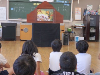 全校よみきかせは、体育館で『手袋を買いに』でした。ステージの奥の壁に映し出された絵本に思わず引き込まれていきました。