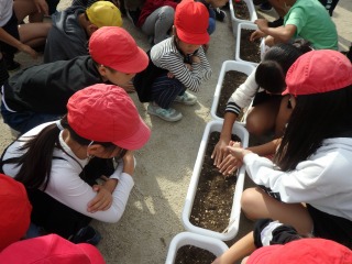 昼休みの「かがやきタイム」で『心の花を咲かせよう~チューリップを植えよう』を全校児童で行いました。来年の1年生が入学する頃には、きれいな花が咲くように異学年で協力して、プランターに球根を植えることができました。プランターは、通路に並べられました。