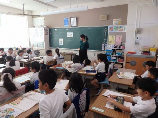 2年3組の道徳では野口英世の自伝から、くじけずに頑張る良さを学んでいました。2年生や1年生の図工はのびのびと作品を作っていました。