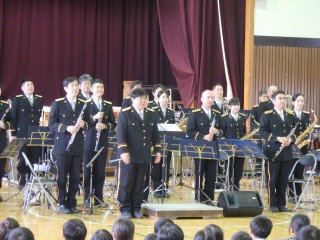 前半のクラシックでは、さすがにプロの集団だという素晴らしい迫力のある演奏でした。曲に合わせて楽器の紹介もしてくれました。音楽隊の演奏で校歌を歌う貴重な体験もできました。