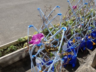 業間休みの時間に第二保育所の園児たちが散歩で北谷小まで来ていました。暑かったのでミストシャワーの下を通ってもらいました。4年2組の体育は高跳びです。レベルに合わせて練習していました。2年1組はマット運動です。一人ずつぶつからないように工夫していました。1年生は校内にいる生き物のスケッチをしていました。ビオトープの魚、飼育小屋のウサギ、管理棟のなまずやメダカ、かめの絵を熱心に描いていました。1年生の朝顔、まだ咲いている鉢がいくつかあります。そこに大きなアゲハ蝶が羽ばたいてきました。