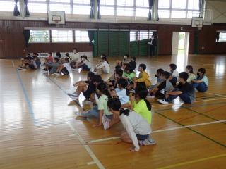 「文化芸術による子供育成総合事業」として、劇団「座・高円寺」のみなさんに来ていただきました。本来なら芸術鑑賞会として多くの学年の皆さんに演劇を見てもらう予定でしたが、新型コロナの関係で中止となり、5年生にのみクラスごとのワークショップを行うことになりました。内容は、手裏剣飛ばしのウォーミングアップの後、劇団が演じている『フランドン農学校の豚』(宮沢賢治 原作)の1シーンをグループで演じることでした。声を出さず体だけで、牧場で飼育されている豚の様子を表現します。1度ステージで発表した後、さらに改良点を加え発表します。各クラス4グループが、短い時間によく話し合って、グループごとの個性的な発表ができました。