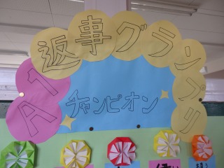 会談が業者によるワックスがけできれいになりました。1階の廊下には手芸クラブの展示や計画代表委員による大きな声で返事をした人の掲示があります。