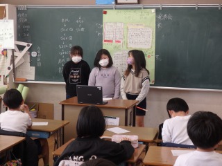 5年2組では、4年生の前で発表する委員会紹介のプレゼンの発表会をしていました。わかりやすくまとめられていました。