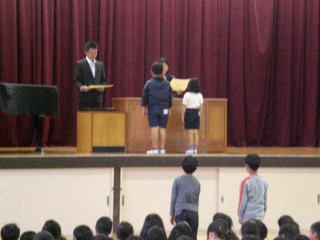 朝の活動は表彰朝会でした。代表として多くの子が校長先生から賞状をいただきました。教室で担任の先生から賞状をいただいた子もいます。発明創意工夫展の作品と研究、読書感想文、絵画コンクール、なまず水泳大会、科学振興展覧会の自由研究、どれも夏休みの課題や大会でした。がんばって取り組んだ成果です。
