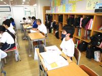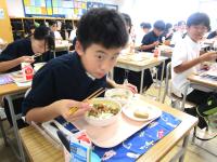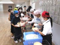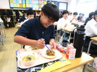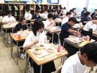 テストの後は、給食の時間です。本日の献立は、十五夜にちなみウサギの形のハンバーグでした。テストで頭脳を使った後の給食は、いつもよりも美味しく感じられたのではないでしょうか。