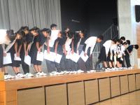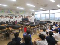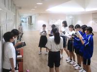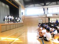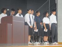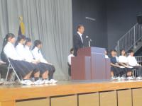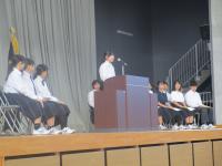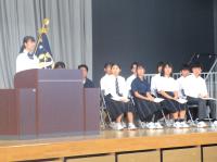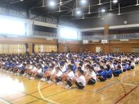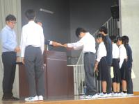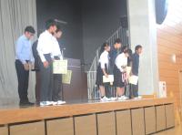 任命式の後、引き続き「表彰集会」が行われました。市プレゼン大会、発明創意くふう展、読書感想文審査会、英語弁論大会のほか、新人体育大会で優秀な成績を収めた部活の選手たちが表彰されました。