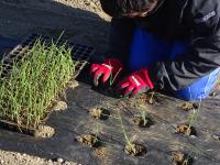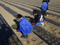 今日は、大空の皆さんが、学校近くの畑で来年度の給食に使われる玉ねぎの植え付けを行いました。一本一本手作業で苗を植えていきました。
