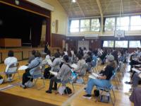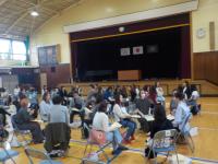 就学時健康診断の裏側では、保護者説明会を行いました。封筒に入っている資料の確認や提出物等について説明を行いました。その後、家庭教育アドバイザーの比嘉 里奈(ひか りな)先生からの公演がありました。公演中は、保護者の方同士で話し合いをしながら交流を深めました。