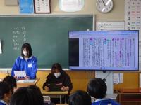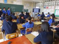 今日は、英語科の先生の研究授業が行われました。自分で作成した英作文をもとに、仲間と英語で対話しながら学びを深めていく学習でした。対話の中では、ジェスチャーがあったり暗記して話したりするなど、伝えたい内容が分かる対話となっていました。