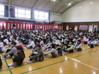 体合唱は体育館に響きました。1年生から5年生までが贈る言葉として、演技、合唱、呼びかけを