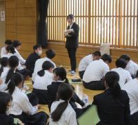 武道場では、つつじ保育園の皆さんが来校し、3年生の保育実習が行われました。保育園の子供たちは、とてもお行儀よく、中学生の話や読み聞かせをしっかりと聞いていました。