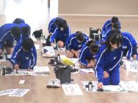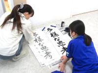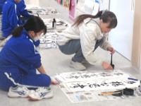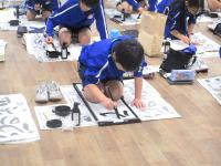 1年生と9組の書初め練習の様子です。生徒たちは、字のつながりと全体のバランスを意識して、お手本をよく見ながら書いていました。シンと静まった空気の中で、集中して取り組んでいました。